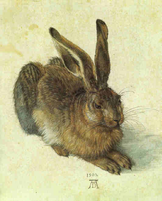 Das Bild gefällt mir, weil es so detailliert ist. Nichts lenkt ab, man kann sich ganz auf den Hasen konzentrieren. Sein Fell ist ein wenig wie das von meinem (schwarzen) Kater. Ich frage mich, wie Dürer den Hasen gemalt hat. Hat er still gesessen? Hat er ihn aus dem Gedächtnis gemalt?